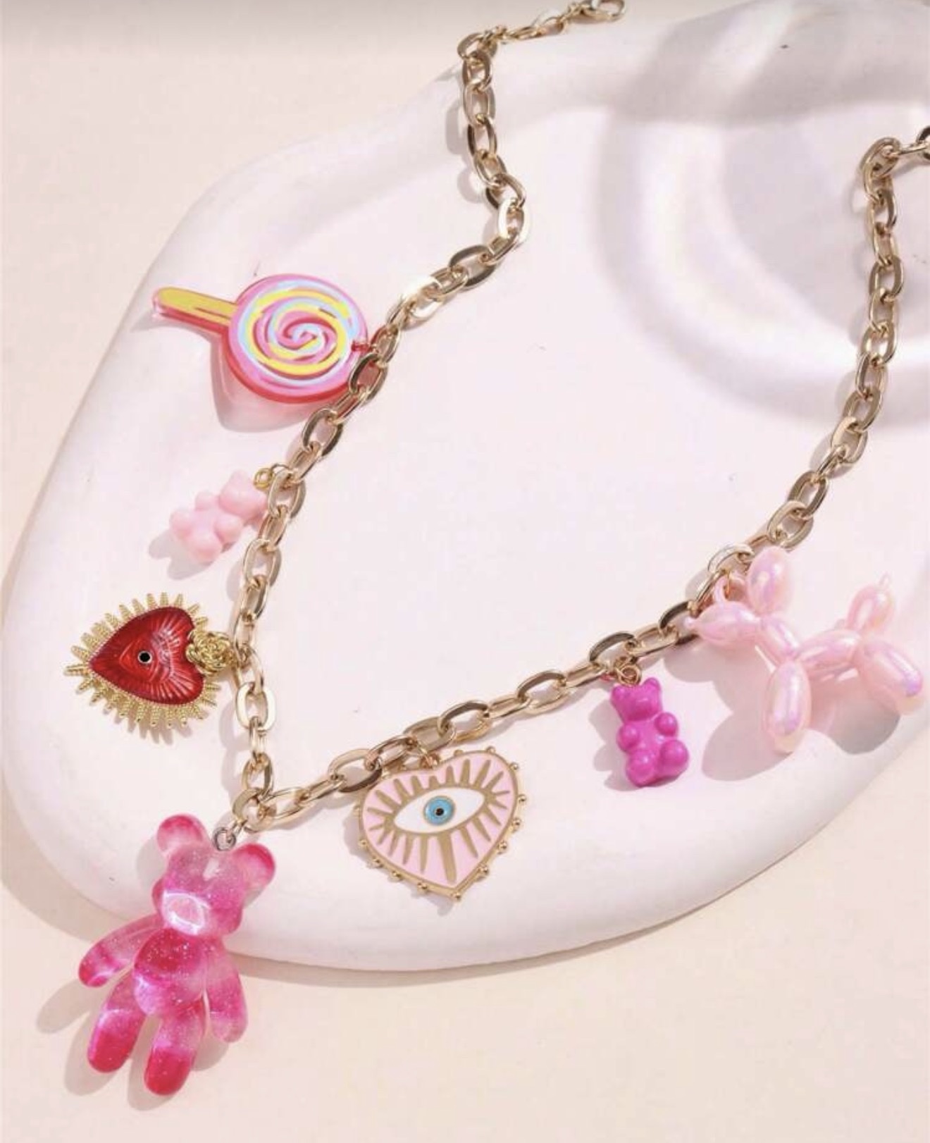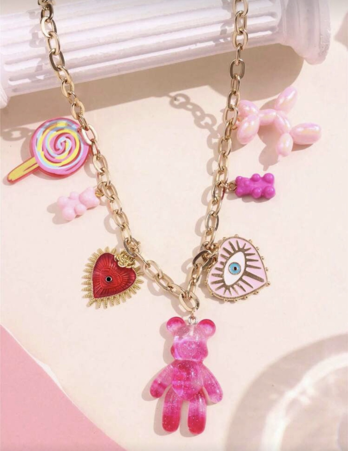 Chaîne dorée ornée de charms cute : ourson jelly, cœur sacré, œil protecteur, bonbon & petits gummy 🧸🍬